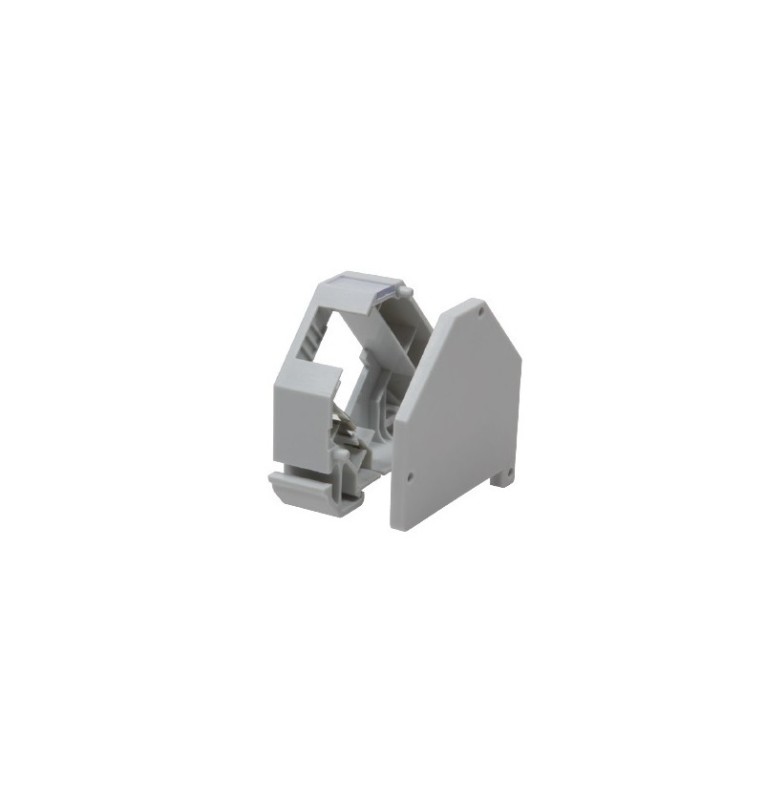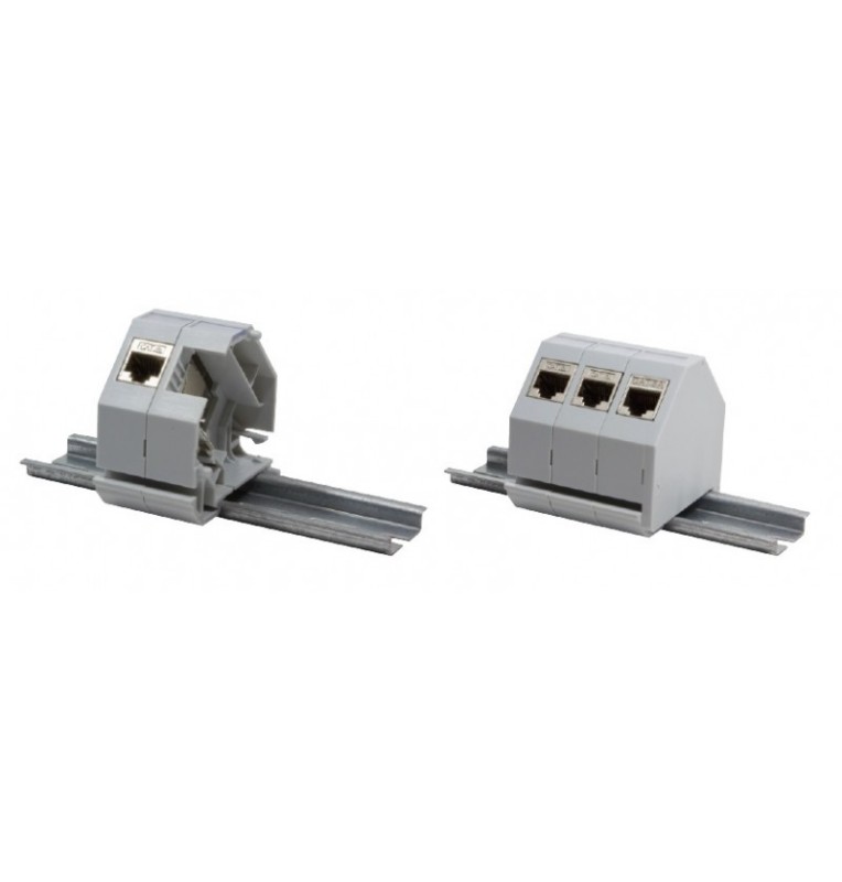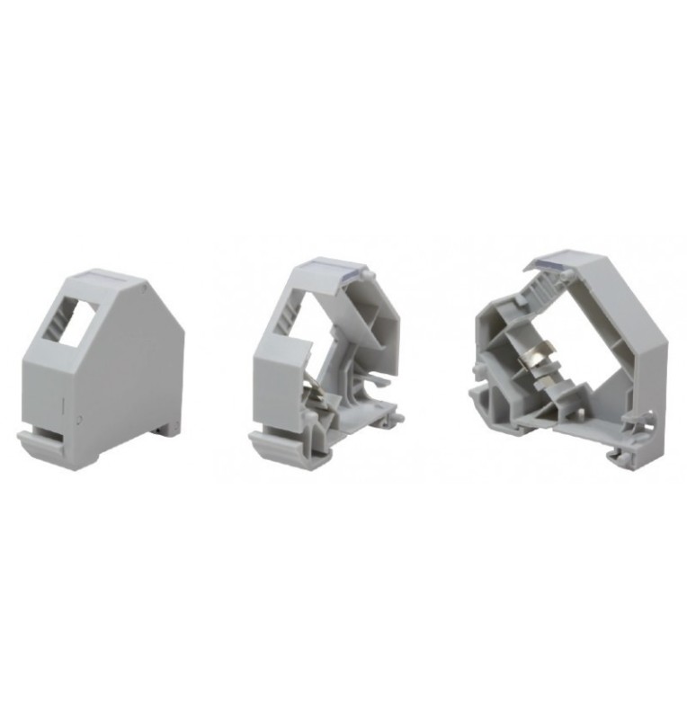 Adaptador para conectores RJ45 tipo Keystone en carril DIN. Material plástico con toma de tierra.