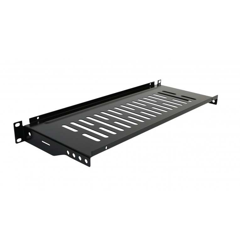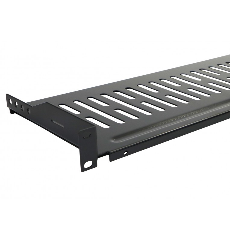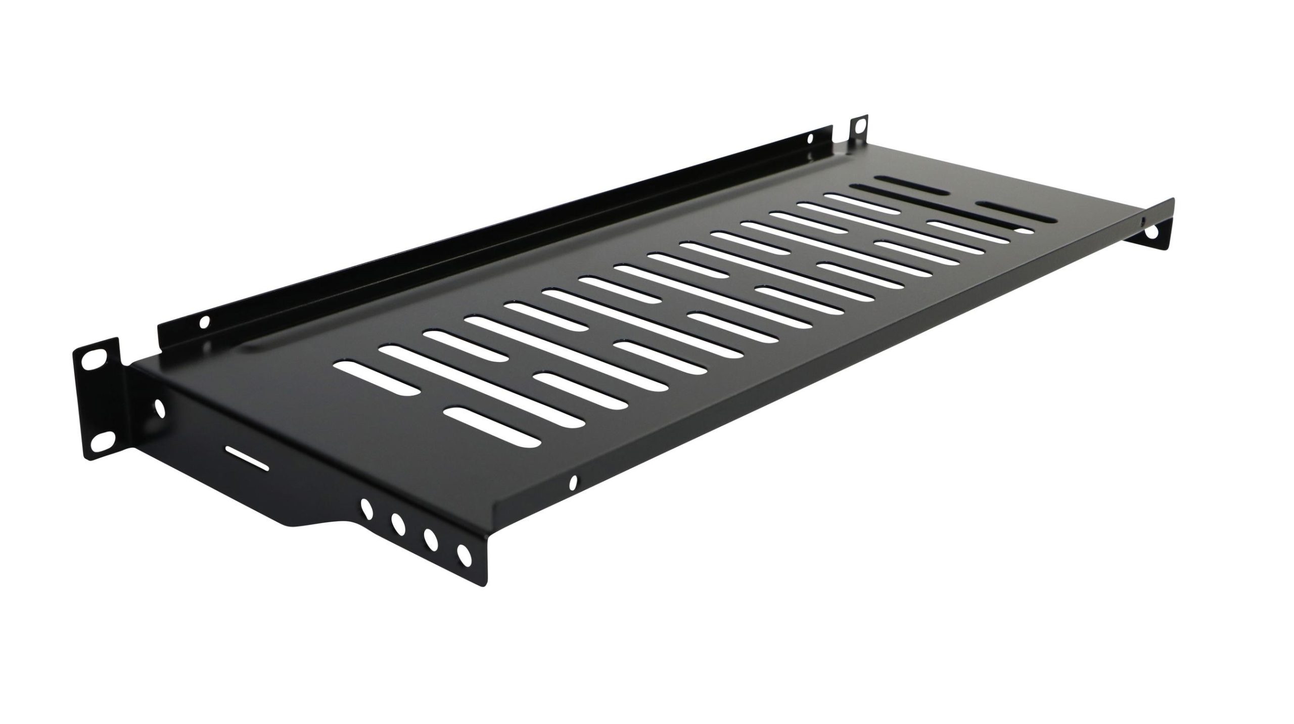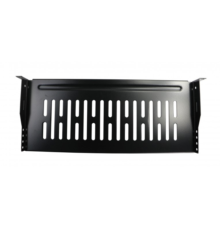 Bandeja metálica colgante para montaje en perfil de 19″ y fondo 400 mm, ideal para la soportación de un amplio abanico de equipos no normalizados 19″ como routers de operadora, mini-switches, grabadores de CCTV, monitores, mini-PC’s, etc. Ref.542-021-BK