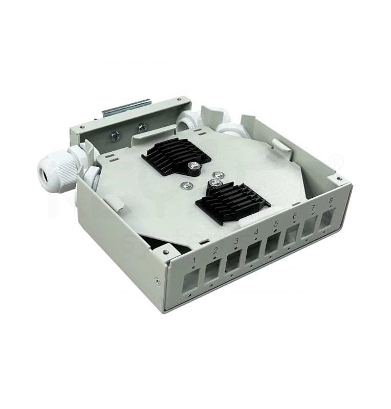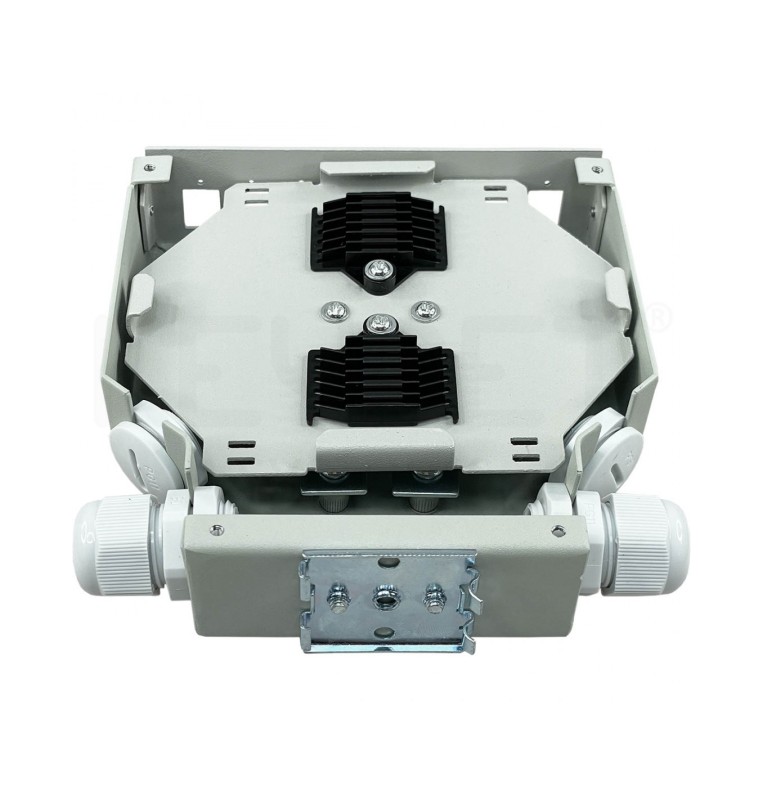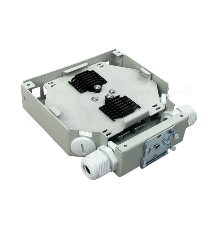 Caja de empalme y distribución fibra óptica para carril DIN. Dimensiones: ancho 35mm x altura 132 mm x profundidad 125 mm.