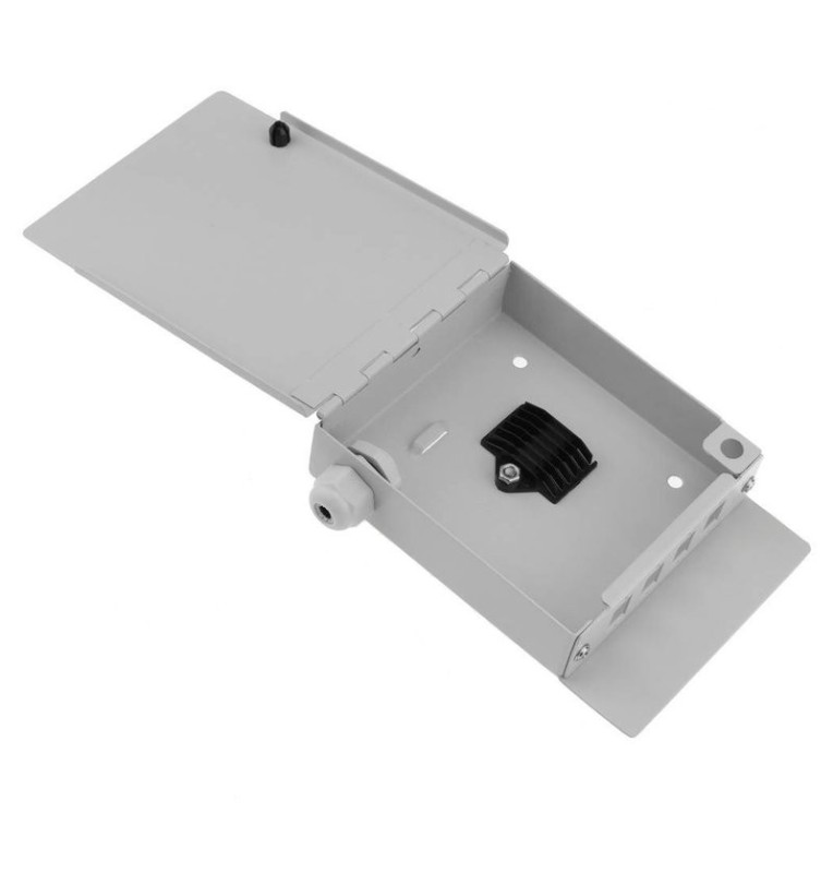Caja terminal mural de Fibra Optica. Prensaestopas PG-9. Panel frontal para 4 Adaptadores  SC Simplex – LC Duplex, Color GRIS. Dimensiones: ancho 140 mm x altura 100 mm x profundidad 30 mm. Ref.FOP0603-410204