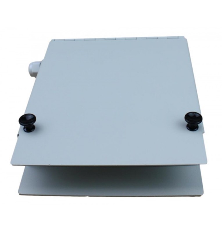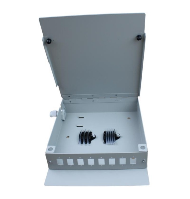 Caja terminal mural de Fibra Optica. Prensaestopas plástico. Panel frontal para 8 Adaptadores SC Simplex – LC Duplex, Color GRIS. Dimensiones: ancho 200 mm x altura 165 mm x profundidad 40 mm. Ref.FOP0603-410208