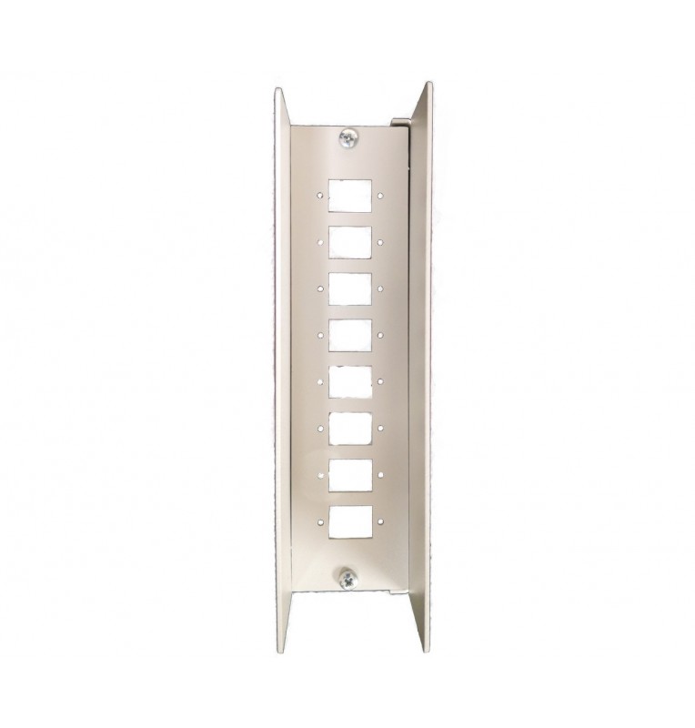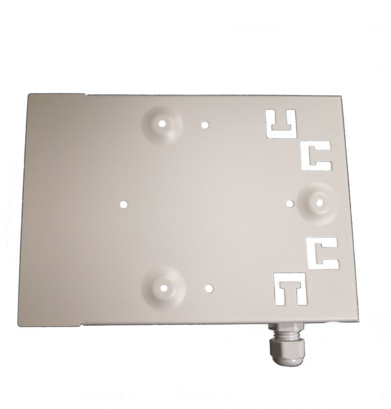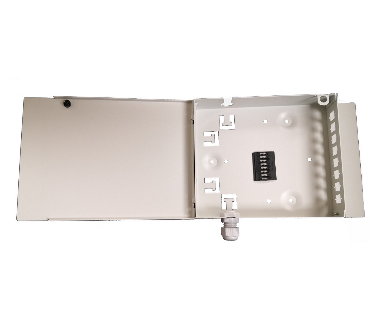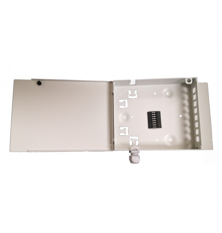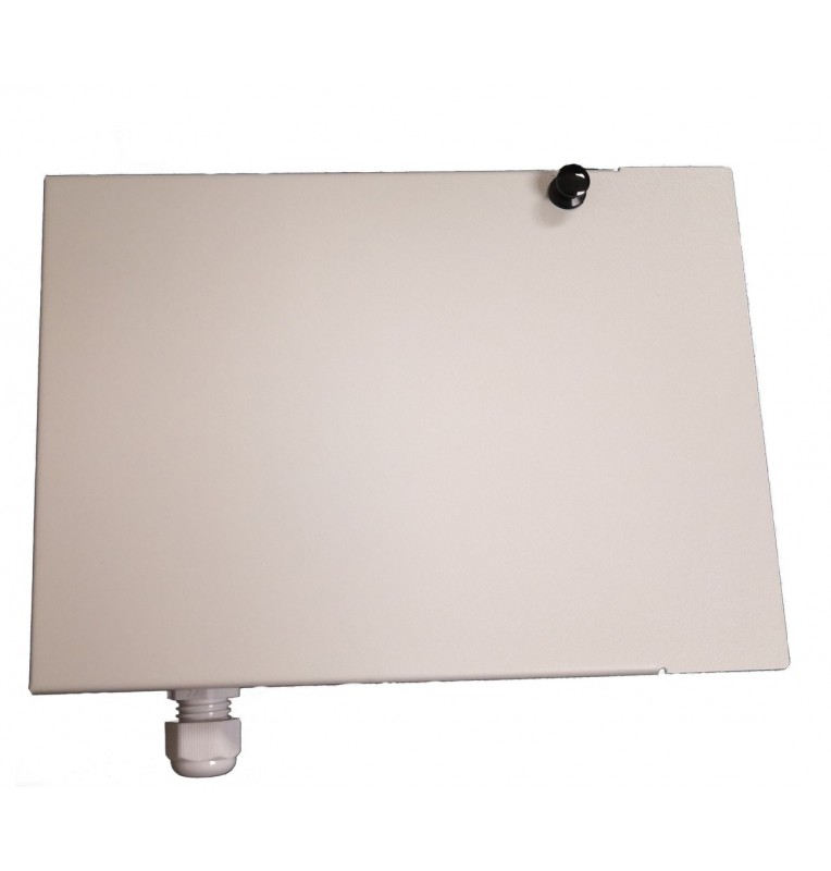 Caja terminal mural de Fibra Optica. Capacidad máxima: cable fibra óptica interior/exterior diámetro 7-11mm. Panel frontal para 8 Adaptadores SC Simplex – LC Quad, fabricado en acero galvanizado pintado color RAL9002. Dimensiones: ancho 200 mm x altura 140 mm x profundidad 30 mm. Peso: 0,90 kg. Ref.0603-410208