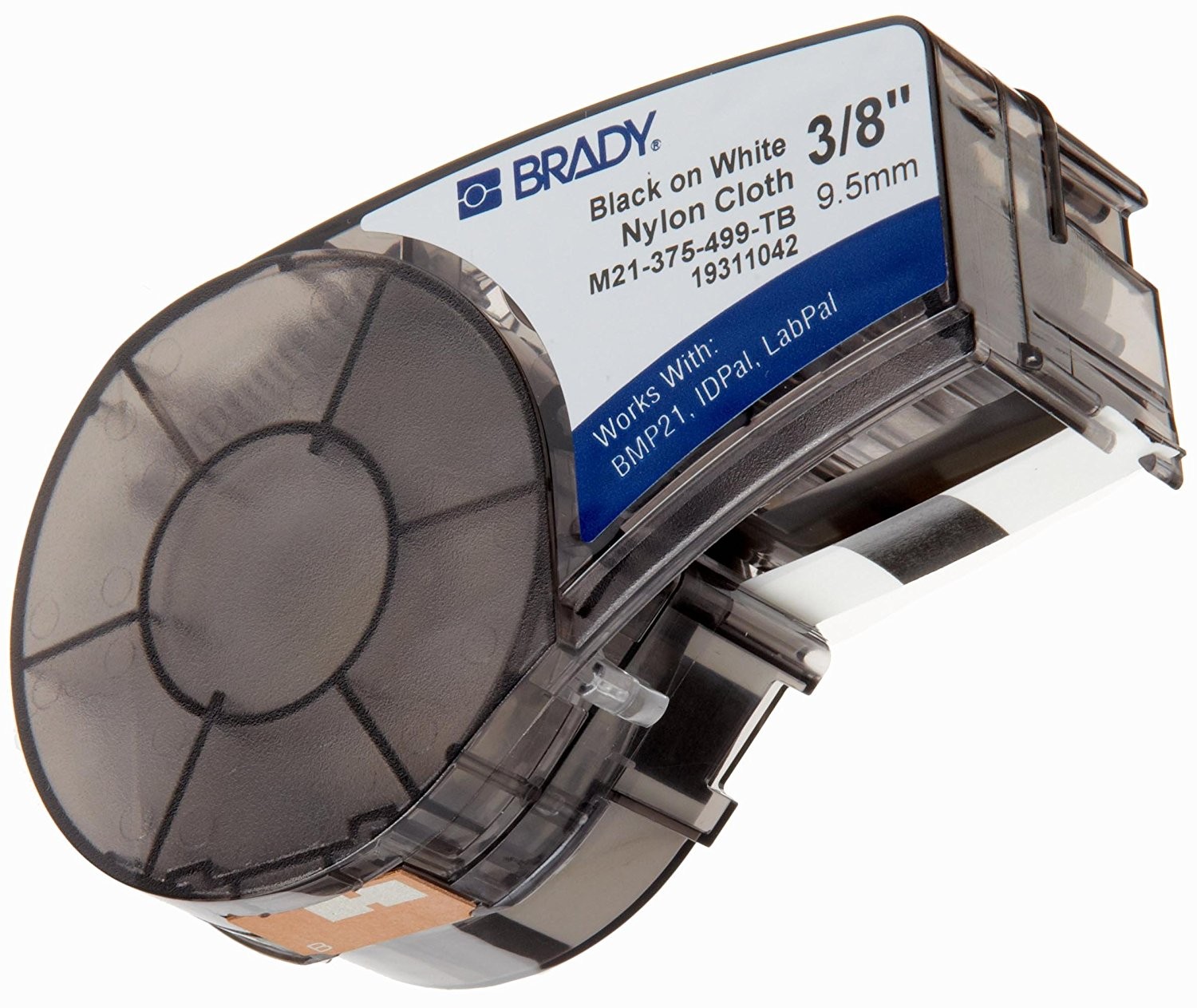 Cartucho Recambio etiquetas adhesivas para bloques terminales o paneles de conexiones. Longitud 4.9 m. Ancho 9,53 mm. Material Nylon (Polyamide). Color de la cinta: Negro sobre Blanco. Para usar con impresoras BRADY BMP21-PLUS, BMP21, ID PAL. Ref. fabricante : M21-375-499-TB