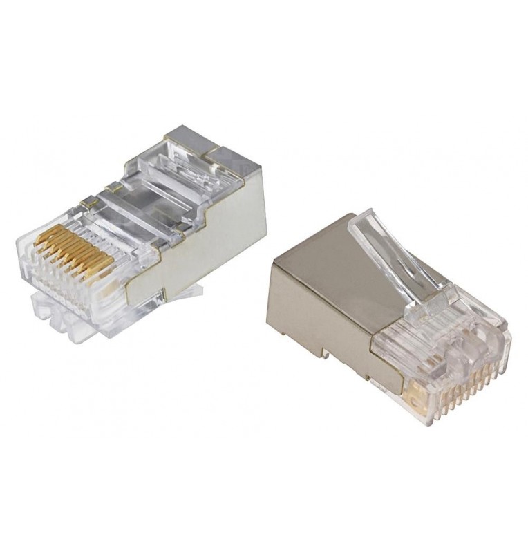 Conector macho RJ45 categoría 5e Apantallado Su terminación por desplazamiento de aislante acepta calibres de cable desde 24 a 26 AWG. Diámetro máximo cable 5.1 mm