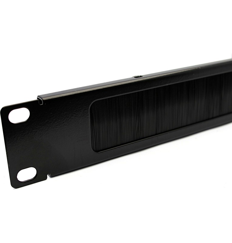 Pasahilos horizontal 19″ 1UA salida de hilos con cepillo cerrado. Fabricado en chapa de hierro, pintura epoxi color negro RAL 9005. Ref. 100-599