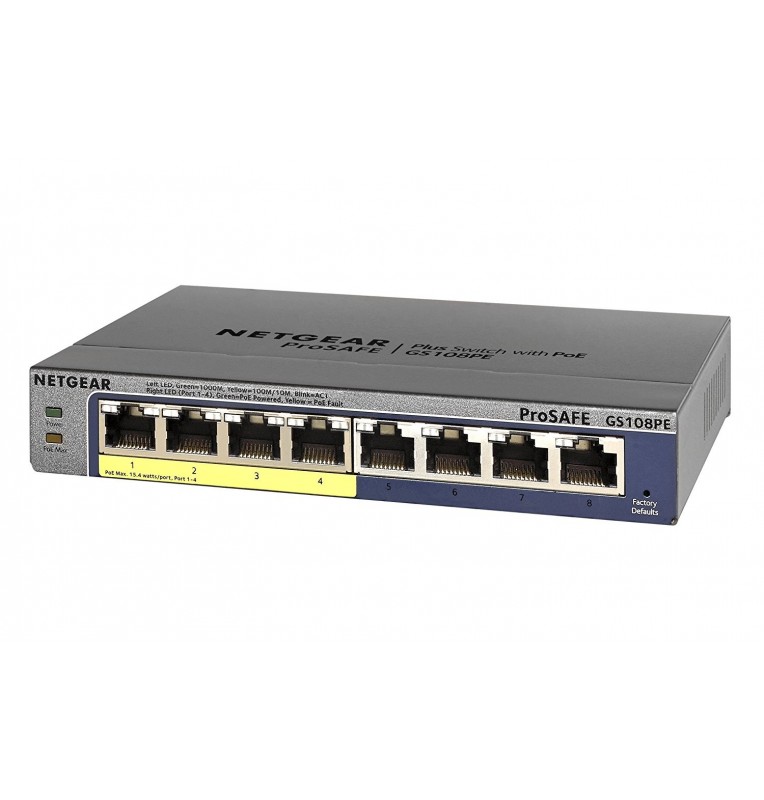Alimentación a través de Ethernet: switch de 8-puertos Gigabit Ethernet con 4 puertos PoE (802.3af) que proporcionan hasta 15 W por puerto con un ahorro de potencia PoE total de 53 W