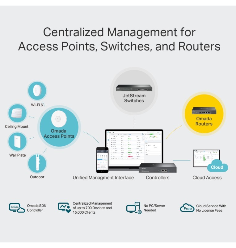 • Administración centralizada: hasta 500 puntos de acceso Omada, 100 conmutadores JetStream y 100 enrutadores Omada.